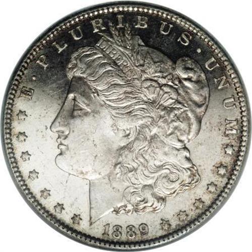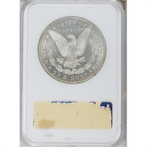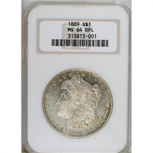 <B>1889 $1 MS64 Deep Mirror Prooflike NGC.</B></I> The mirrored fields are lightly toned in freckles of orange-gold and russet. The strike is good aside from the olive branch, which has uneven relief, as ejected from the dies. A common date overall, but scarce with prominently mirrored fields. Certified in a former generation holder. Census: 58 in 64 DMPL, 15 finer (10/07).<BR><BR><b>Shipping:</b> Coins & Currency (<a target="_blank" href="http://www.heritageauctions.com/common/shipping.php">view shipping information</a>)
