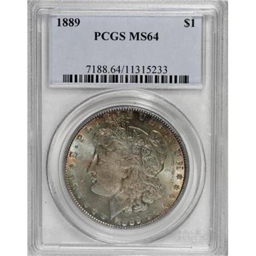<B>1889 $1 MS64 PCGS.</B></I> PCGS Population (5849/1422). NGC Census: (9852/1699). Mintage: 21,726,812. Numismedia Wsl. Price for NGC/PCGS coin in MS64: $55. (#7188)<BR><BR><B>Coin Engraver:</B> George T. Morgan<BR><BR><b>Shipping:</b> Coins & Currency (<a target="_blank" href="http://www.heritageauctions.com/common/shipping.php">view shipping information</a>)
