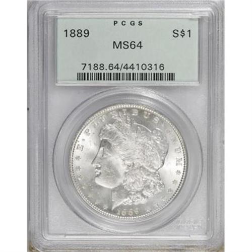 <B>1889 $1 MS64 PCGS.</B></I> PCGS Population (5907/1470). NGC Census: (9999/1735). Mintage: 21,726,812. Numismedia Wsl. Price for NGC/PCGS coin in MS64: $55. (#7188)<BR><BR><B>Coin Engraver:</B> George T. Morgan<BR><BR><b>Shipping:</b> Coins & Currency (<a target="_blank" href="http://www.heritageauctions.com/common/shipping.php">view shipping information</a>)