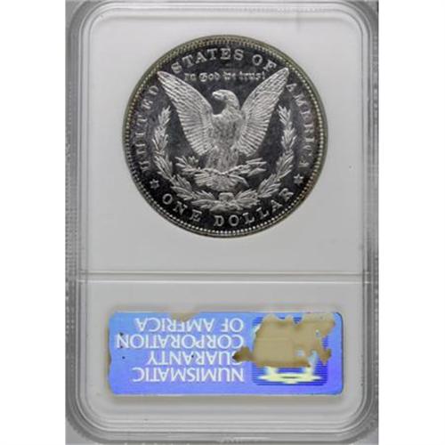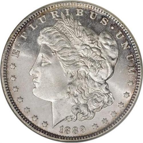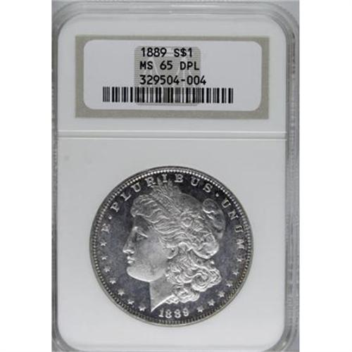 <B>1889 $1 MS65 Deep Mirror Prooflike NGC.</B></I> Flashy and deeply reflective with a trace of gunmetal patina at the margins. A touch of haze is present in the carefully preserved fields. Unlike the majority of Deep Mirror Prooflike P-mint Morgans, this example displays a modicum of contrast. NGC has graded just one finer Deep Mirror Prooflike representative (6/07).<BR><BR><b>Shipping:</b> Coins & Currency (<a target="_blank" href="http://www.heritageauctions.com/common/shipping.php">view shipping information</a>)