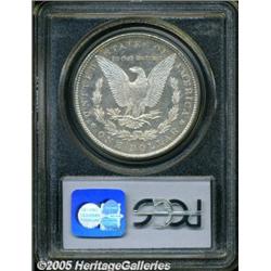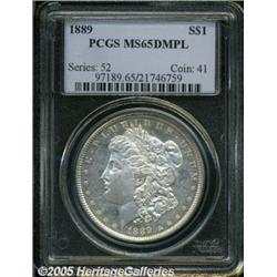 <B>1889<img border='0' src='http://www.heritagecoins.com/images/star.gif' width=10 height=10>$1 MS65 Deep Mirror Prooflike PCGS.</B></I> A few hundred 1889 Morgan Dollars have been certified as Deep Mirror Prooflike by NGC and PCGS, the vast majority of which grade no finer than MS64. This important Gem is devoid of toning--a feature that allows full appreciation of the deep mirrored reflectivity in the fields. There is some mint frost over the obverse portrait, sharp striking definition being readily evident throughout. A minimally abraded, Gem quality representative of this, the highest mintage (21.7 million pieces) Morgan Dollar of the 1878-1904 era. Population: 29 in 65 DMPL, 3 finer (2/05).