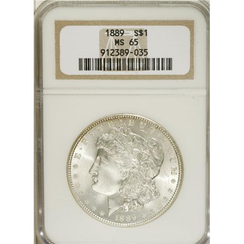 <B>1889 $1 MS65 NGC.</B></I> NGC Census: (3160/202). PCGS Population (1279/144). Mintage: 21,726,812. Numismedia Wsl. Price for NGC/PCGS coin in MS65: $280. (#7188)<BR><BR><b>Shipping:</b> Coins & Currency (<a target="_blank" href="http://www.heritageauctions.com/common/shipping.php">view shipping information</a>)