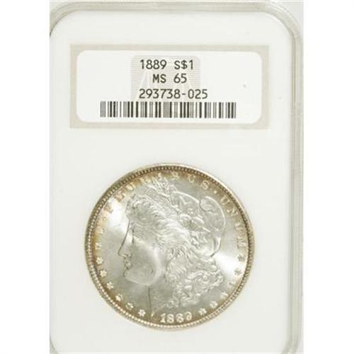 <B>1889 $1 MS65 NGC.</B></I> NGC Census: (1597/102). PCGS Population (1301/147). Mintage: 21,726,812. Numismedia Wsl. Price for NGC/PCGS coin in MS65: $280. (#7188)<BR><BR><B>Coin Engraver:</B> George T. Morgan<BR><BR><b>Shipping:</b> Coins & Currency (<a target="_blank" href="http://www.heritageauctions.com/common/shipping.php">view shipping information</a>)
