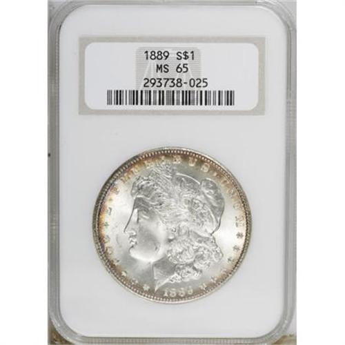 <B>1889 $1 MS65 NGC.</B></I> NGC Census: (1631/104). PCGS Population (1322/148). Mintage: 21,726,812. Numismedia Wsl. Price for NGC/PCGS coin in MS65: $280. (#7188)<BR><BR><B>Coin Engraver:</B> George T. Morgan<BR><BR><b>Shipping:</b> Coins & Currency (<a target="_blank" href="http://www.heritageauctions.com/common/shipping.php">view shipping information</a>)