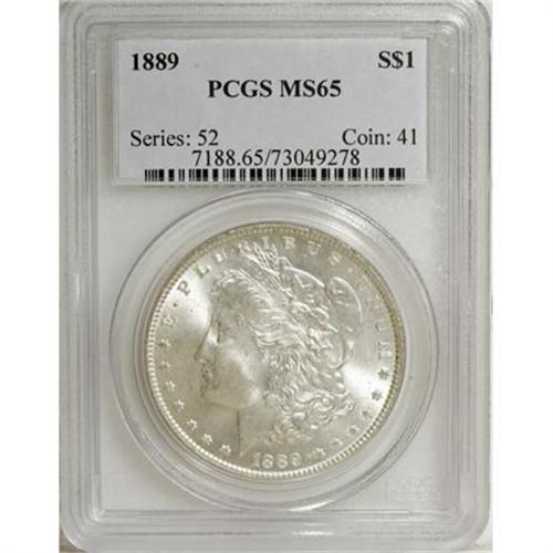 <B>1889 $1 MS65 PCGS.</B></I> In 1993, Dave Bowers estimated that there were 5,000 to 10,000 1889 Morgan dollars in existence, at the Gem level of preservation. So far, however, fewer than 3,000 such coins have been certified through the combined efforts of NGC and PCGS, as of (10/07). This example is lustrous and untoned, with well defined design elements and just a few minor marks on Liberty's cheek and in the left obverse field. <BR><BR><B>Coin Engraver:</B> George T. Morgan<BR><BR><b>Shipping:</b> Coins & Currency (<a target="_blank" href="http://www.heritageauctions.com/common/shipping.php">view shipping information</a>)
