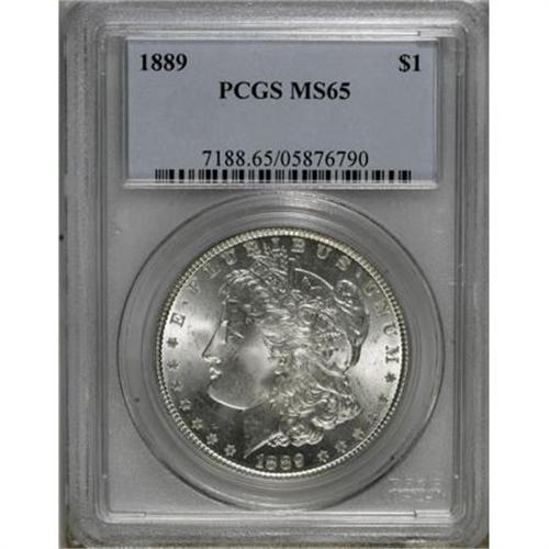 <B>1889 $1 MS65 PCGS.</B></I> PCGS Population (1369/151). NGC Census: (1629/106). Mintage: 21,726,812. Numismedia Wsl. Price for NGC/PCGS coin in MS65: $250. (#7188)<BR><BR><B>Coin Engraver:</B> George T. Morgan<BR><BR><b>Shipping:</b> Coins & Currency (<a target="_blank" href="http://www.heritageauctions.com/common/shipping.php">view shipping information</a>)
