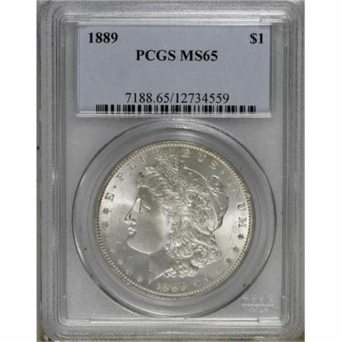 <B>1889 $1 MS65 PCGS.</B></I> PCGS Population (1369/151). NGC Census: (1629/106). Mintage: 21,726,812. Numismedia Wsl. Price for NGC/PCGS coin in MS65: $250. (#7188)<BR><BR><B>Coin Engraver:</B> George T. Morgan<BR><BR><b>Shipping:</b> Coins & Currency (<a target="_blank" href="http://www.heritageauctions.com/common/shipping.php">view shipping information</a>)