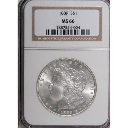 <B>1889 $1 MS66 NGC.</B></I> A well executed strike complements fantastic luster on this Premium Gem. A few grade-consistent, minuscule marks are not bothersome. NGC has seen a mere two coins finer, and PCGS five higher.<BR><BR><B>Coin Engraver:</B> George T. Morgan<BR><BR><b>Shipping:</b> Coins & Currency (<a target="_blank" href="http://www.heritageauctions.com/common/shipping.php">view shipping information</a>)