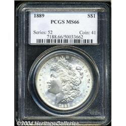 <table><tbody><tr><td><table> <TR><TD width="100%"><TABLE cellSpacing=1 cellPadding=3 width="100%" border=0><TBODY><TR><TD width="100%" bgColor=#79735c><FONT face=arial color=#ffffff size=3><B>Description</B> </FONT></TD></TR><TR><TD width="100%" bgColor=#ffffff><FONT face=arial size=2><B>1889 $1 MS66 PCGS.</B></I> An uncommonly well preserved representative of this otherwise common P-mint Morgan, both sides are frosty-white in sheen with only a trace of tan toning on the reverse. There are also no bothersome abrasions to report, and the strike is bold-to-sharp in all areas. Perfect for premium quality Gem type purposes. Population: 75 in 66, there are only three finer (10/03).<BR><I>From the Dylan Elijah Collection of Morgan Dollars.</B></I> </FONT></TD></TR></TBODY></TABLE></TD></TR></TBODY></TABLE><BR><A name=PricesRealized></A><TABLE cellSpacing=0 cellPadding=0 width="100%" bgColor=#000000 border=0><TBODY><TR><TD width="100%"><TABLE cellSpacing=1 cellPadding=3 width="100%" border=0><TBODY><TR><TD width="100%" bgColor=#79735c><A name=PR><FONT face=arial color=#ffffff size=3><B>Previous Prices from Heritage Auctions</B> </FONT></A></TD></TR><TR><TD bgColor=#f6f6ed><TABLE cellSpacing=0 cellPadding=0 width="100%" border=1><TBODY><TR><TD align=middle width="33%"><B>Date</B></TD><TD align=middle width="33%"><B>Service</B></TD><TD align=middle width="33%"><B>Price</B></TD></TR><TR bgColor=whitesmoke><TD width="33%"><B>11/25/2003</B></TD><TD width="33%">NGC</TD><TD width="33%">$1,437.50</TD></TR><TR bgColor=whitesmoke><TD width="33%"><B>06/24/2003</B></TD><TD width="33%">PCGS</TD><TD width="33%">$1,955.00</TD></TR><TR bgColor=whitesmoke><TD width="33%"><B>01/07/2004</B></TD><TD width="33%">PCGS</TD><TD width="33%">$2,070.00</TD></TR><TR bgColor=whitesmoke><TD width="33%"><B>09/20/2003</B></TD><TD width="33%">NGC</TD><TD width="33%">$1,150.00</TD></TR><TR bgColor=whitesmoke><TD width="33%"><B>07/29/2003</B></TD><TD width="33%">PCGS</TD><TD width="33%">$1,897.50</TD></TR><TR bgColor=whitesmoke><TD width="33%"><B>01/11/2003</B></TD><TD width="33%">PCGS</TD><TD width="33%">$2,645.00</TD></TR><TR bgColor=whitesmoke><TD width="33%"><B>01/12/2002</B></TD><TD width="33%">NGC</TD><TD width="33%">$1,265.00</TD></TR><TR bgColor=whitesmoke><TD width="33%"><B>10/06/2001</B></TD><TD width="33%">NGC</TD><TD width="33%">$921.15</TD></TR><TR bgColor=whitesmoke><TD width="33%"><B>08/08/2001</B></TD><TD width="33%">NGC</TD><TD width="33%">$891.25</TD></TR><TR bgColor=whitesmoke><TD width="33%"><B>01/05/2001</B></TD><TD width="33%">PCGS</TD><TD width="33%">$2,760.00</TD></TR><TR bgColor=whitesmoke><TD width="33%"><B>04/23/1999</B></TD><TD width="33%">PCGS</TD><TD width="33%">$2,070.00</TD></TR><TR bgColor=whitesmoke><TD width="33%"><B>08/02/1997</B></TD><TD width="33%">ANACS</TD><TD width="33%">$1,265.00</TD></TR><TR bgColor=whitesmoke><TD width="33%"><B>07/31/1993</B></TD><TD width="33%">PCGS</TD><TD width="33%">$1,925.00</TD></TR><TR bgColor=whitesmoke><TD width="33%"><B>03/01/1999</B></TD><TD width="33%">NGC</TD><TD width="33%">$1,610.00</TD></TR></TBODY></TABLE></TD></TR><TR><TD bgColor=#ffffff><FONT face=arial size=1 ?>PLEASE NOTE: All prices realized reflect the final hammer price PLUS the buyer's premium in auctions that charge a buyer's premium. Each item has a notation at the top of the listing indicating whether that lot included a buyer's premium. Example: A item that sells with a final hammer price of $100 and a 20% buyer's premium will display with a price realized of $120. All information listed is intended to be as accurate as possible, but errors are possible. Please use this guide carefully and inform us of any inaccuracies. </FONT></TD></TR></TBODY></TABLE></TD></TR></TBODY></TABLE><BR><TABLE cellSpacing=0 cellPadding=0 width="100%" bgColor=#000000 border=0><TBODY><TR><TD width="100%"><TABLE cellSpacing=1 cellPadding=3 width="100%" border=0><TBODY><TR><TD width="100%" bgColor=#79735c colSpan=6><FONT face=arial color=#ffffff size=3><B>Price Guide*</B> </FONT></TD></TR><TR bgColor=#f6f6ed><TD align=middle><B>Grade</B> </TD><TD align=middle><B>Coin World<BR>(Trends)</B> </TD><TD align=middle><B>Numismedia<BR>Retail</B> </TD><TD align=middle><B>Numismedia<BR>Wholesale</B> </TD><TD align=middle><B>Coin<BR>Universe</B> </TD><TD align=middle><B>Heritage<BR>Value Index</B> </TD></TR><TR bgColor=#ffffff><TD align=middle>65</TD><TD align=right>$360.00</TD><TD align=right>$290.00</TD><TD align=right>$232.00</TD><TD align=right>$300.00</TD><TD align=right>$205.38</TD></TR><TR style="FONT-WEIGHT: bold" bgColor=#cccfdd><TD align=middle>66</TD><TD align=right>$2,500.00</TD><TD align=right>---</TD><TD align=right>$1,900.00</TD><TD align=right>$2,750.00</TD><TD align=right>$1,692.50</TD></TR><TR bgColor=#ffffff><TD align=middle>67</TD><TD align=right>---</TD><TD align=right>---</TD><TD align=right>$8,550.00</TD><TD align=right>$11,500.00</TD><TD align=right>$7,737.50</TD></TR><TR bgColor=#ffffff><TD colSpan=6><FONT size=1>*All information listed is intended to be as accurate as possible, but errors are possible. No item may be returned or refused based on this information which is provided as a service to our customers. You should contact each pricing source directly to determine the accuracy of this information. </FONT></TD></TR></TBODY></TABLE></TD></TR></TBODY></TABLE><BR><TABLE cellSpacing=0 cellPadding=0 width="100%" bgColor=#000000 border=0><TBODY><TR><TD width="100%"><TABLE cellSpacing=1 cellPadding=3 width="100%" border=0><TBODY><TR><TD width="100%" bgColor=#79735c><FONT face=arial color=#ffffff size=3><B>Population Guide</B> </FONT></TD></TR><TR bgColor=#ffffff><TD align=middle><!-- Begin Output of Population Grid--><TABLE cellSpacing=0 cellPadding=0 width="100%" border=0><TBODY><TR><TD vAlign=center><TABLE cellSpacing=0 width="100%" border=1 cellsadding="3"><TBODY><TR><TD vAlign=center><TABLE cellSpacing=0 cellPadding=3 width="100%" border=1><TBODY><TR><TD vAlign=center align=middle bgColor=#f0f1e8 c