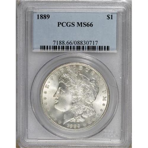 <B>1889 $1 MS66 PCGS.</B></I> Liberty's ear is lightly die doubled. A Hot 50 variety, and probably VAM-16, since the right-side stars are also lightly die doubled. Lustrous and well struck with magnificently smooth surfaces. Liberty's cheek is particularly close to pristine. Nearly unobtainable any finer.<BR><BR><b>Shipping:</b> Coins & Currency (<a target="_blank" href="http://www.heritageauctions.com/common/shipping.php">view shipping information</a>)