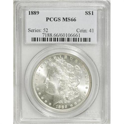 <B>1889 $1 MS66 PCGS.</B></I> <B>1889 $1 MS66 PCGS.</B></I> A warm, matte mint glow shows on the untoned surfaces. This is a well struck coin, void of any distractions of consequence.<BR><I>From The Motor City Collection.</B></I><BR><BR><B>Coin Engraver:</B> George T. Morgan<BR><BR><b>Shipping:</b> Coins & Currency (<a target="_blank" href="http://www.heritageauctions.com/common/shipping.php">view shipping information</a>)