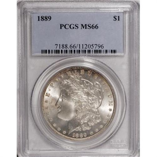<B>1889 $1 MS66 PCGS.</B></I> Faint ruby and tan toning graces the rims of this lustrous Premium Gem. Solidly struck and refreshingly clean with a particularly smooth cheek. PCGS and NGC combined have certified just seven pieces finer (1/08).<BR><I>From The Oxford Collection.</B></I><BR><BR><B>Coin Engraver:</B> George T. Morgan<BR><BR><b>Shipping:</b> Coins & Currency (<a target="_blank" href="http://www.heritageauctions.com/common/shipping.php">view shipping information</a>)