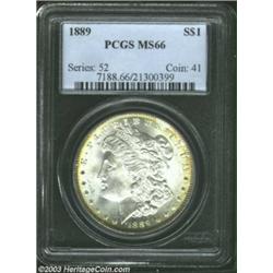 <TABLE cellSpacing=0 cellPadding=0 width="100%" bgColor=#000000 border=0><TBODY><TR><TD width="100%"><TABLE cellSpacing=1 cellPadding=3 width="100%" border=0><TBODY><TR><TD width="100%" bgColor=#79735c><FONT face=arial color=#ffffff size=3><B>Description</B> </FONT></TD></TR><TR><TD width="100%" bgColor=#ffffff><FONT face=arial size=2><B>1889 $1 MS66 PCGS.</B></I> This example displays pleasing satiny surfaces and a well rounded cheek. It presents an appealing opportunity for anyone wishing to obtain an aesthetically pleasing Morgan Dollar, at the premium quality Gem level of preservation. Population: 53 in 66, 4 finer (4/03). </FONT></TD></TR></TBODY></TABLE></TD></TR></TBODY></TABLE><BR><A name=PricesRealized></A><TABLE cellSpacing=0 cellPadding=0 width="100%" bgColor=#000000 border=0><TBODY><TR><TD width="100%"><TABLE cellSpacing=1 cellPadding=3 width="100%" border=0><TBODY><TR><TD width="100%" bgColor=#79735c><A name=PR><FONT face=arial color=#ffffff size=3><B>Previous Prices from Heritage Auctions</B> </FONT></A></TD></TR><TR><TD bgColor=#f6f6ed><TABLE cellSpacing=0 cellPadding=0 width="100%" border=1><TBODY><TR><TD align=middle width="33%"><B>Date</B></TD><TD align=middle width="33%"><B>Service</B></TD><TD align=middle width="33%"><B>Price</B></TD></TR><TR bgColor=whitesmoke><TD width="33%"><B>09/13/1997</B></TD><TD width="33%">PCGS</TD><TD width="33%">$1,840.00</TD></TR><TR bgColor=whitesmoke><TD width="33%"><B>06/24/2003</B></TD><TD width="33%">PCGS</TD><TD width="33%">$1,955.00</TD></TR><TR bgColor=whitesmoke><TD width="33%"><B>07/29/2003</B></TD><TD width="33%">PCGS</TD><TD width="33%">$1,897.50</TD></TR><TR bgColor=whitesmoke><TD width="33%"><B>04/27/2002</B></TD><TD width="33%">NGC</TD><TD width="33%">$1,150.00</TD></TR><TR bgColor=whitesmoke><TD width="33%"><B>02/23/2001</B></TD><TD width="33%">NGC</TD><TD width="33%">$1,265.00</TD></TR><TR bgColor=whitesmoke><TD width="33%"><B>01/12/2002</B></TD><TD width="33%">NGC</TD><TD width="33%">$1,265.00</TD></TR><TR bgColor=whitesmoke><TD width="33%"><B>10/06/2001</B></TD><TD width="33%">NGC</TD><TD width="33%">$921.15</TD></TR><TR bgColor=whitesmoke><TD width="33%"><B>08/08/2001</B></TD><TD width="33%">NGC</TD><TD width="33%">$891.25</TD></TR><TR bgColor=whitesmoke><TD width="33%"><B>06/10/2000</B></TD><TD width="33%">NGC</TD><TD width="33%">$891.25</TD></TR><TR bgColor=whitesmoke><TD width="33%"><B>10/08/1994</B></TD><TD width="33%">NGC</TD><TD width="33%">$1,705.00</TD></TR><TR bgColor=whitesmoke><TD width="33%"><B>03/01/1999</B></TD><TD width="33%">NGC</TD><TD width="33%">$1,610.00</TD></TR><TR bgColor=whitesmoke><TD width="33%"><B>01/11/2003</B></TD><TD width="33%">PCGS</TD><TD width="33%">$2,875.00</TD></TR><TR bgColor=whitesmoke><TD width="33%"><B>01/11/2003</B></TD><TD width="33%">PCGS</TD><TD width="33%">$2,645.00</TD></TR><TR bgColor=whitesmoke><TD width="33%"><B>01/01/2001</B></TD><TD width="33%">PCGS</TD><TD width="33%">$2,070.00</TD></TR><TR bgColor=whitesmoke><TD width="33%"><B>01/05/2001</B></TD><TD width="33%">PCGS</TD><TD width="33%">$2,760.00</TD></TR><TR bgColor=whitesmoke><TD width="33%"><B>01/12/2002</B></TD><TD width="33%">PCGS</TD><TD width="33%">$2,185.00</TD></TR><TR bgColor=whitesmoke><TD width="33%"><B>08/08/2001</B></TD><TD width="33%">PCGS</TD><TD width="33%">$1,840.00</TD></TR><TR bgColor=whitesmoke><TD width="33%"><B>07/31/1993</B></TD><TD width="33%">PCGS</TD><TD width="33%">$1,925.00</TD></TR><TR bgColor=whitesmoke><TD width="33%"><B>04/23/1999</B></TD><TD width="33%">PCGS</TD><TD width="33%">$2,070.00</TD></TR><TR bgColor=whitesmoke><TD width="33%"><B>08/02/1997</B></TD><TD width="33%">ANACS</TD><TD width="33%">$1,265.00</TD></TR></TBODY></TABLE></TD></TR><TR><TD bgColor=#ffffff><FONT face=arial size=1 ?>PLEASE NOTE: All prices realized reflect the final hammer price PLUS the buyer's premium in auctions that charge a buyer's premium. Each item has a notation at the top of the listing indicating whether that lot included a buyer's premium. Example: A item that sells with a final hammer price of $100 and a 20% buyer's premium will display with a price realized of $120. All information listed is intended to be as accurate as possible, but errors are possible. Please use this guide carefully and inform us of any inaccuracies. </FONT></TD></TR></TBODY></TABLE></TD></TR></TBODY></TABLE><BR><TABLE cellSpacing=0 cellPadding=0 width="100%" bgColor=#000000 border=0><TBODY><TR><TD width="100%"><TABLE cellSpacing=1 cellPadding=3 width="100%" border=0><TBODY><TR><TD width="100%" bgColor=#79735c colSpan=6><FONT face=arial color=#ffffff size=3><B>Price Guide*</B> </FONT></TD></TR><TR bgColor=#f6f6ed><TD align=middle><B>Grade</B> </TD><TD align=middle><B>Coin World<BR>(Trends)</B> </TD><TD align=middle><B>Numismedia<BR>Retail</B> </TD><TD align=middle><B>Numismedia<BR>Wholesale</B> </TD><TD align=middle><B>Coin<BR>Universe</B> </TD><TD align=middle><B>Heritage<BR>Value Index</B> </TD></TR><TR bgColor=#ffffff><TD align=middle>65</TD><TD align=right>$360.00</TD><TD align=right>$295.00</TD><TD align=right>$236.00</TD><TD align=right>$300.00</TD><TD align=right>$216.75</TD></TR><TR style="FONT-WEIGHT: bold" bgColor=#cccfdd><TD align=middle>66</TD><TD align=right>$2,500.00</TD><TD align=right>---</TD><TD align=right>$1,875.00</TD><TD align=right>$2,500.00</TD><TD align=right>$1,898.75</TD></TR><TR bgColor=#ffffff><TD align=middle>67</TD><TD align=right>---</TD><TD align=right>---</TD><TD align=right>$8,550.00</TD><TD align=right>$8,500.00</TD><TD align=right>$6,687.50</TD></TR><TR bgColor=#ffffff><TD colSpan=6><FONT size=1>*All information listed is intended to be as accurate as possible, but errors are possible. No item may be returned or refused based on this information which is provided as a service to our customers. You should contact each pricing source directly to determine the accuracy of this information. </FONT></TD></TR></TBODY></TABLE></TD></TR></TBODY></TABLE><BR><TABLE cellSpacing=0 cellPadding=0 width="10
