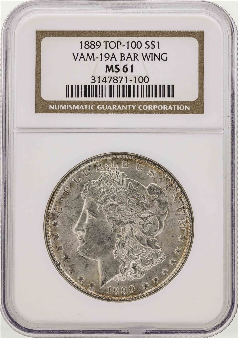 One 1889 $1 Morgan Silver Dollar Coin VAM-19A BAR Wing NGC MS61. NGC Certified.