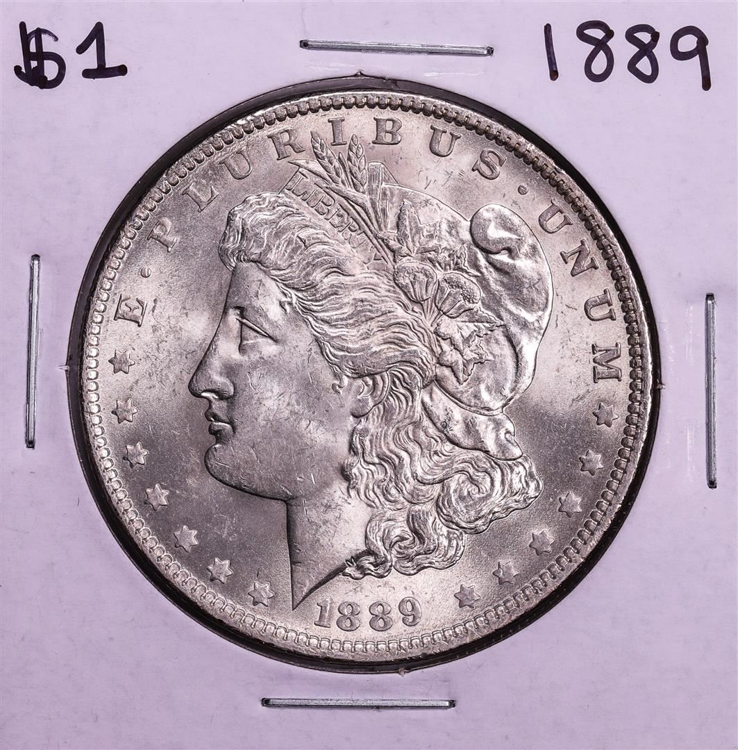 One 1889 $1 Morgan Silver Dollar Coin.