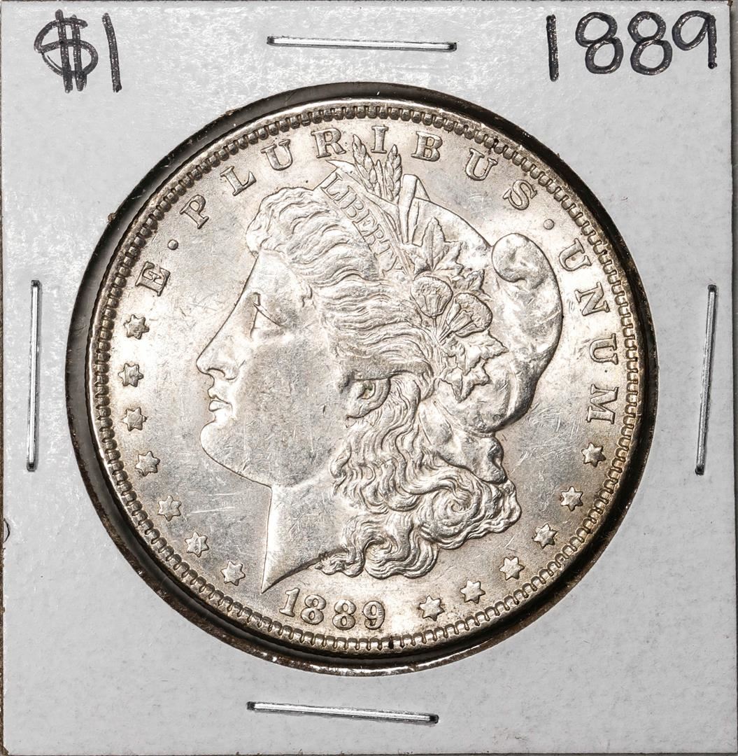 One 1889 $1 Morgan Silver Dollar Coin.