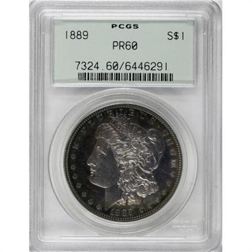 <B>1889 $1 PR60 PCGS.</B></I> This proof Morgan dollar issue consisted of 815 pieces, and around 300 coins have been certified through the combined efforts of NGC and PCGS (including possible resubmissions). This piece is fully struck, with deep electric-blue and sea-green peripheral toning, and dark, deeply watery fields. There are no contact marks on either side, but a few grade-limiting hairlines are noted in the fields. <BR><BR><B>Coin Engraver:</B> George T. Morgan<BR><BR><b>Shipping:</b> Coins & Currency (<a target="_blank" href="http://www.heritageauctions.com/common/shipping.php">view shipping information</a>)