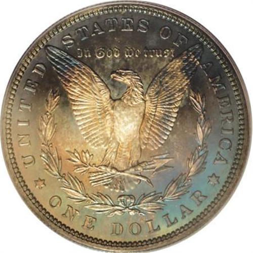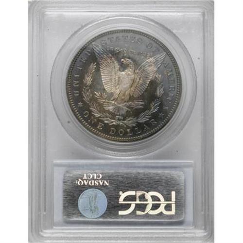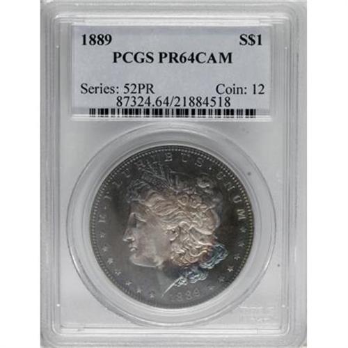 <B>1889 $1 PR64 Cameo PCGS.</B></I> Perhaps conservatively graded as a near-Gem, this lovely proof Dollar seems fully struck, displaying none of the typical flatness above Liberty's ear and on the eagle's breast. Lovely cobalt-blue and crimson-pink toning embraces the nearly blemish-free surfaces, as the nicely contrasted devices rest above unfathomably deep fields. No bothersome hairlines are present, although a thin mark is noted on the eagle's breast. Population: 8 in 64 Cameo, 10 finer (6/07).<BR><BR><b>Shipping:</b> Coins & Currency (<a target="_blank" href="http://www.heritageauctions.com/common/shipping.php">view shipping information</a>\)