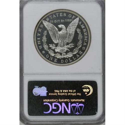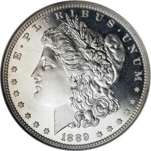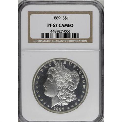 <B>1889 $1 PR67 Cameo NGC.</B></I> The proof 1889 Morgan issue presents certain challenges for the series connoisseur. In his <I>The Morgan and Peace Dollar Textbook</B></I>, Wayne Miller highlighted several problems that often affect specimens, including occasional poor highpoint detail, low-key cameo effects, frequent contrast-nullifying patina, and significant hairlines. The piece offered here, however, offers a welcome alternative to the typical candidate.<BR> The gleaming fields are exquisitely preserved and show distinct contrast with the boldly impressed, moderately frosted devices. Whispers of toning visit the surfaces, including a touch of milky patina on the portrait and hints of gold at the margins, but the overall effect is minimal. A delightful representative that offers incredible eye appeal. Census: 10 in 67 Cameo, 1 finer (12/07).<BR><BR><b>Shipping:</b> Coins & Currency (<a target="_blank" href="http://www.heritageauctions.com/common/shipping.php">view shipping information</a>)
