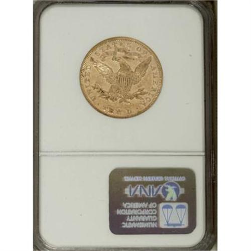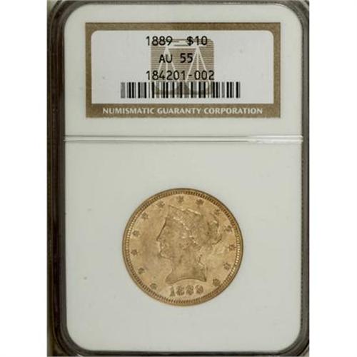 <B>1889 $10 AU55 NGC.</B></I> Close to Mint State, and the surfaces are unperturbed aside from inconspicuous scuffs in the field beneath the hair bun. The 1889 has long been targeted by speculators, due to a compellingly low production of only 4,440 pieces.<BR><BR><B>Coin Engraver:</B> Christian Gobrecht<BR><BR><b>Shipping:</b> Coins & Currency (<a target="_blank" href="http://www.heritageauctions.com/common/shipping.php">view shipping information</a>)