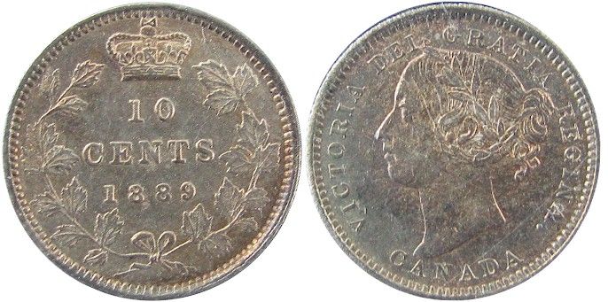 1889 10¢ ICCS AU50. Key issue with green to gold tint. A very rare date and seldom seen above VF-20.