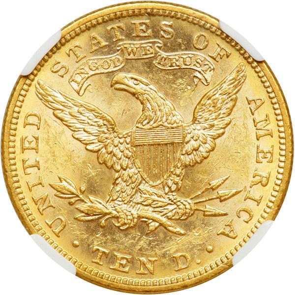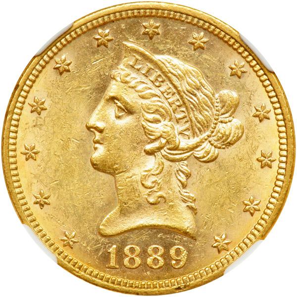 1889 $10 Liberty. NGC graded MS-60. Lightly toned. Only 4,485 pieces minted of this semi-key date. Lustrous and well struck with the usual light bagmarks present. The period 1889 to 1896 was a time of stress in the East Coast (and European) gold markets. Forces were at work causing a drain on Treasury supplies of gold. This resulted in a series of moneymarket panics and shows itself in reduced gold Eagle and Double Eagle production figures at Philadelphia (but not in San Francisco's mintage). 1889 in particular saw a huge reduction in mintage over the years before. Things only returned to normal slowly thereafter (PCGS # 8715) .