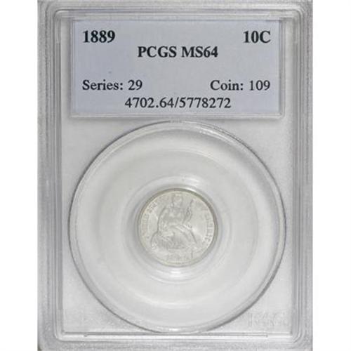 <B>1889 10C MS64 PCGS.</B></I> PCGS Population (77/78). NGC Census: (85/84). Mintage: 7,380,000. Numismedia Wsl. Price for NGC/PCGS coin in MS64: $312. (#4702)<BR><BR><B>Coin Engraver:</B> Christian Gobrecht<BR><BR><b>Shipping:</b> Coins & Currency (<a target="_blank" href="http://www.heritageauctions.com/common/shipping.php">view shipping information</a>)