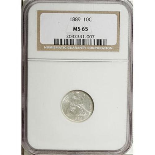 <B>1889 10C MS65 NGC.</B></I> Blazing luster illuminates this stone-white and intricately struck Gem. Even the aid of a loupe fails to locate noticeable contact. Census: 57 in 65, 28 finer (8/07).<BR><BR><B>Coin Engraver:</B> Christian Gobrecht<BR><BR><b>Shipping:</b> Coins & Currency (<a target="_blank" href="http://www.heritageauctions.com/common/shipping.php">view shipping information</a>)