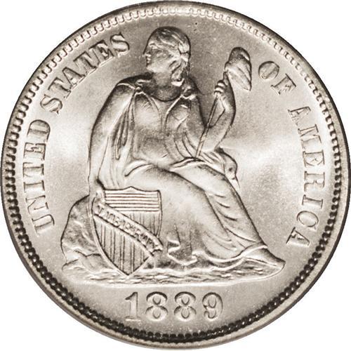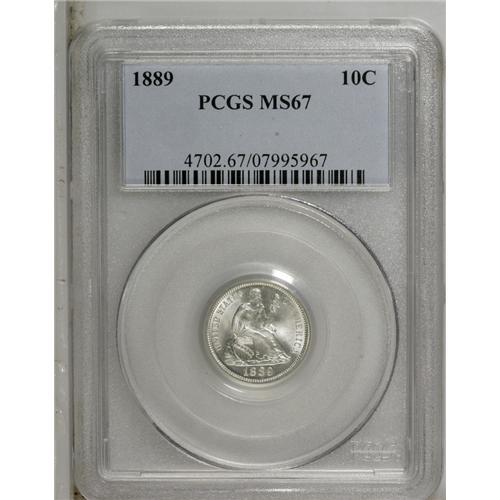 <B>1889 10C MS67 PCGS.</B></I> The blazing snow-white surfaces display a dazzling, frosty sheen on both sides. The striking details are uniformly bold throughout, and excellent for the type. Faint die clash marks are noted in the fields, but, as expected, distracting surface marks are entirely absent. Population: 4 in 67, 0 finer (10/06).<BR><BR><b>Shipping:</b> Coin/Currency (<a target="_blank" href="http://www.heritageauctions.com/common/shipping.php">view shipping information</a>)