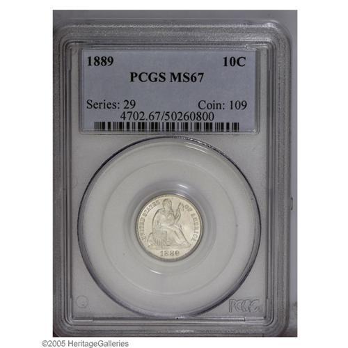 <B>1889<10C> MS67 PCGS.</B></I> This lustrous and completely brilliant Superb Gem has attractively preserved surfaces. Well struck except for a few grains of wheat on the upper left portion of the wreath. An excellent candidate for an advanced type set. Population: 7 in 67, none finer (9/05).