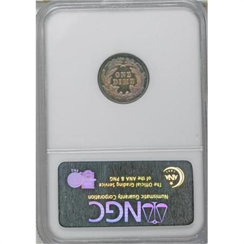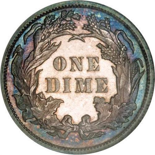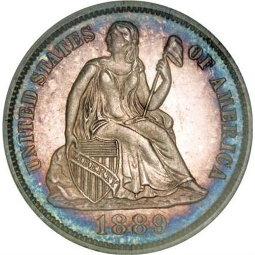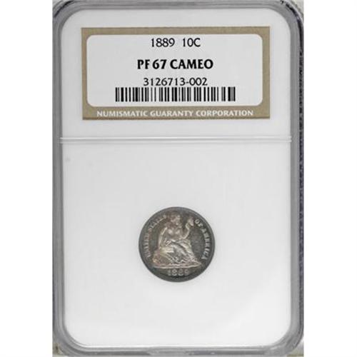 <B>1889 10C PR67 Cameo NGC.</B></I> Beautiful toning is seen on both sides, in concentric circles of aquamarine, maroon, and rose. The centers are toned a very light lilac, allowing the devices an opportunity to showcase their frosted nature. Boldly struck and extremely clean, with an attractive look. Census: 4 in 67 Cameo with a sole example certified finer (11/07).<BR><BR><b>Shipping:</b> Coins & Currency (<a target="_blank" href="http://www.heritageauctions.com/common/shipping.php">view shipping information</a>)