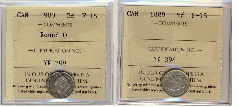 1889 & 1900 RD 0 5¢ ICCS F15. Lot of 2 coins.