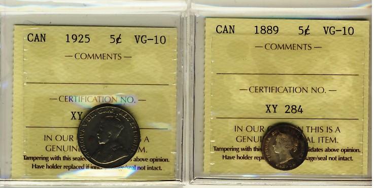 1889 & 1925 5¢ ICCS VG10. Lot of 2 coins.