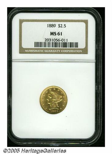 <B>1889<$2 1/2> MS61 NGC.</B></I> Bright yellow-gold patina rests over lustrous surfaces that display sharply struck design features, save for weakness in the eagle's right leg feathers. Miniscule abrasions are scattered over each side.
