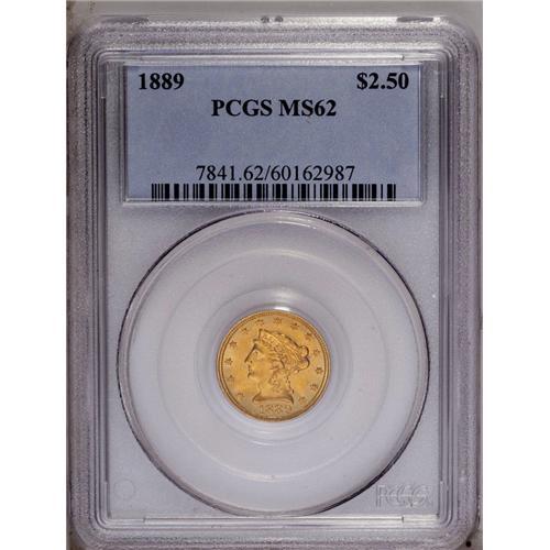 <B>1889<$2 1/2> MS62 PCGS.</B></I> Impressive from a technical perspective, but this peach-gold piece has three bright, parallel mint-made roller marks across the lower half of the portrait. Just 17,600 pieces were struck.