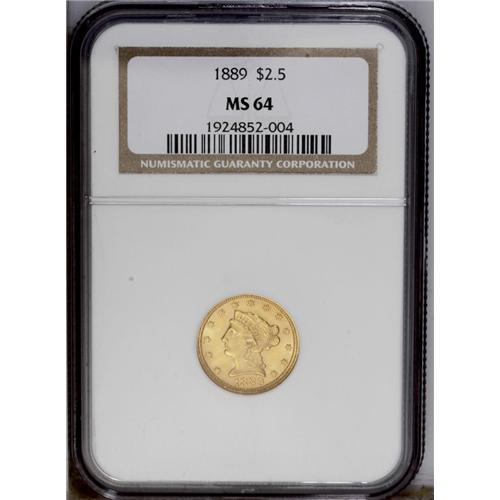 <B>1889<$2 1/2> MS64 NGC.</B></I> Razor-sharp detail is visible even on the most intricate elements of the design, and the frosty luster remains unbroken. A solid near-Gem that will fit well into a type or date set. <BR><BR><B>Important notice:</B> Heritage usually auctions material at the rate of 200-250 lots per hour. On some occasions eBay Live bid software or the Internet may not be able to keep up with the pace of the auction. We recommend placing a realistic absentee bid now as insurance to avoid disappointment. Occasionally the auctioneer may eliminate or reject an eBay Live bid, and the auctioneer may also reopen a lot after the close of the eBay live bidding (usually because we missed an audience bid), and may reject your bid even if it shows you as the winning bidder. By bidding via eBay Live, you agree that Heritage may award the lot to another bidder at its sole discretion under the circumstances described above or any other reasonable circumstances. Since eBay bids are not shown to us until we open the lot on the floor, we treat those bids just like floor bids. In most cases the floor responds before the eBay bid is presented to us, due to Internet lag time, so for consistency we have made it a policy that floor bids are always considered first over tie eBay live bids. Also please note that all Heritage lots purchased through eBay Live carry a 20% Buyer's Premium. Please make sure you read the Terms and Conditions before you bid. This lot is being auctioned in conjunction with a live floor auction by Heritage Galleries & Auctioneers. All final auction and invoice information will be supplied by Heritage Galleries & Auctioneers, and all other information should be considered preliminary. Lot:2443 <BR><BR><B>Winning Notification and Billing:</B> After the FINAL session in this auction is complete, Heritage will send e-mail and snail mail invoices. This process normally takes several days. All final auction and invoice information will be supplied by Heritage Galleries & Auctioneers, and all other information should be considered preliminary. <BR><BR>This auction will be conducted on a live auction floor and over the Internet through eBay Live. If you choose to place an absentee bid, please take a moment to <font color='#0000ff'><u><a href='http://pages.ebay.com/liveauctions/help/before/laabsentee.html'>learn how eBay Live absentee bidding works</a></u></font><font color='#000000'>