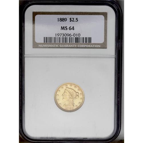 <B>1889<$2 1/2> MS64 NGC.</B></I> Well struck except for a hint of weakness on the lower left leg of the eagle. A modestly lustrous near-Gem that has a hint of reddish-pink patina. Census: 28 in 64, 8 finer (7/06).
