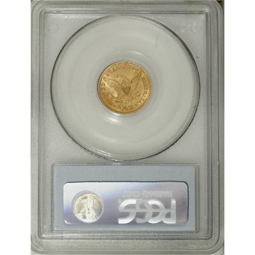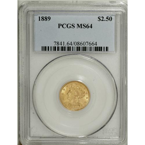 <B>1889 $2 1/2 MS64 PCGS.</B></I> All of the design elements are sharply struck, save for minor weakness on a few of the obverse stars. Intense sparkling luster radiates from each side, illuminating lovely apricot-gold coloration. Only 17,600 business strikes were produced of this scarcer, late date issue. Population: 40 in 64, 6 finer (11/06).<BR><BR><b>Shipping:</b> Coin/Currency (<a target="_blank" href="http://www.heritageauctions.com/common/shipping.php">view shipping information</a>)