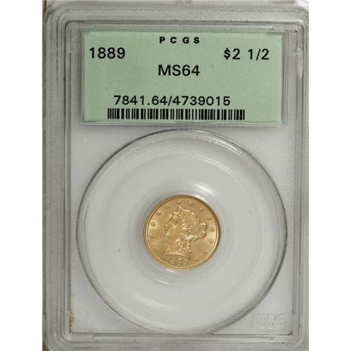 <B>1889 $2 1/2 MS64 PCGS.</B></I> Both sides have highly lustrous apricot-gold fields, and this example displays better-than-average definition in Liberty's hair and the eagle's feathers. A few minor obverse marks limit the grade. Population: 36 in 64, 6 finer (6/06).<BR><BR><b>Shipping:</b> Coin/Currency (<a target="_blank" href="http://www.heritageauctions.com/common/shipping.php">view shipping information</a>)