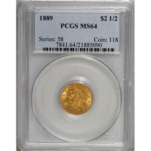 <B>1889 $2 1/2 MS64 PCGS.</B></I> Apricot-gold surfaces are imbued with traces of light green, and radiate pleasing luster. A few minute marks keep this well struck coin from full Gem status. Population: 39 in 64, 6 finer (7/07).<BR><BR><B>Coin Engraver:</B> Christian Gobrecht<BR><BR><b>Shipping:</b> Coins & Currency (<a target="_blank" href="http://www.heritageauctions.com/common/shipping.php">view shipping information</a>)