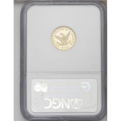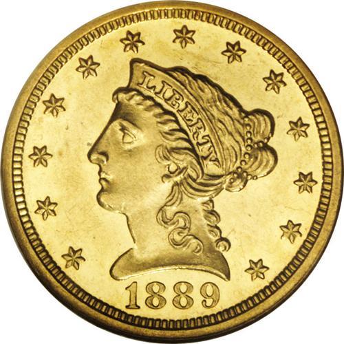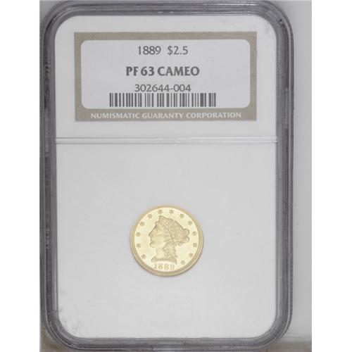 <B>1889 $2 1/2 PR63 Cameo NGC.</B></I> A well mirrored specimen with pleasing yellow-gold color and just a few wispy handling marks in the fields. The 1889 boasts the second lowest mintage of any proof quarter eagle from the decade of the 1880s, an imposing 48 pieces. Based on the scarcity of appearances in our auctions (just two specimens over the past 15 years), we can conclude that its rarity is directly affected by a more limited production. Census: 2 in 63 Cameo, 8 finer (1/06).