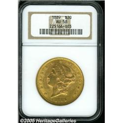 <B>1889 $20 AU58 NGC.</B></I> Sharply struck, with bright apricot-gold surfaces imbued with traces of light olive-green. The typical number of small bagmarks scattered is noted. A mere 44,070 business strikes were produced.