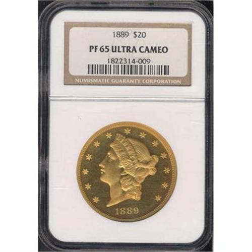 <b>1889 $20 Liberty. NGC graded PF65 UC.</b> This is a truly spectacular cameo Proof whose warm, antique-golden surfaces are deeply mirrored in the fields (lovely "orange-peel" effect) and then contrast sharply against the thick golden mint frost on the devices, so thick in fact that it earned NGC's "ultra" notation on the holder. Even close scrutiny with a 5- to 10-power glass fails to reveal any marks, hairlines, carbon, or other so-called identifiers (really, small problems, but coin professionals like the euphemism). Truly, the surfaces of this premium grade specimen are just that: premium quality. The NGC serial number on this coin is 1822314-009.