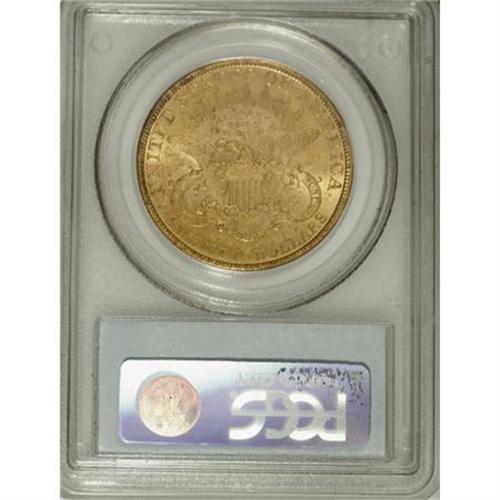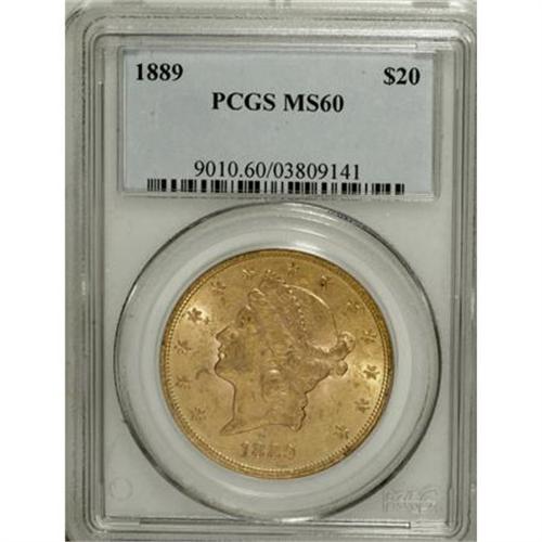 <B>1889 $20 MS60 PCGS.</B></I> The 1889 double eagle, with a relatively low mintage of 44,070 business strikes, is a scarce issue. The most potent luster on this example occurs in the areas around the design elements. Yellow-gold surfaces exhibit tints of light green and tan, and are moderately abraded.<BR><BR><B>Coin Engraver:</B> James B. Longacre<BR><BR><b>Shipping:</b> Coins & Currency (<a target="_blank" href="http://www.heritageauctions.com/common/shipping.php">view shipping information</a>)