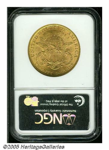 <B>1889<$20> MS61 NGC.</B></I> Frosty and highly lustrous, with pretty pink and mint-green toning, and numerous small abrasions, on both obverse and reverse, that define the grade of the piece. A scarcer date with an impressively low mintage of only 44,111 pieces.