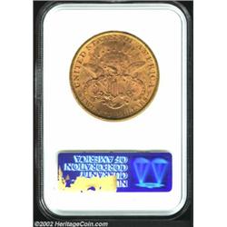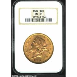 1889 $20 MS61 NGC. The fields are greenish-gold in color, with some pinkish patina in the centers. A