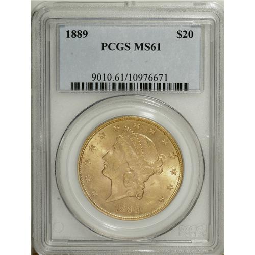 <B>1889 $20 MS61 PCGS.</B></I> A satiny representative with streaks of deeper violet color on the reverse. Reeding marks on Liberty's cheek are the most obvious distraction. While only modestly scarce in Mint State, this issue's mintage of just 44,000 pieces has long made it popular with gold collectors.<BR><BR><b>Shipping:</b> Coin/Currency (<a target="_blank" href="http://www.heritageauctions.com/common/shipping.php">view shipping information</a>)