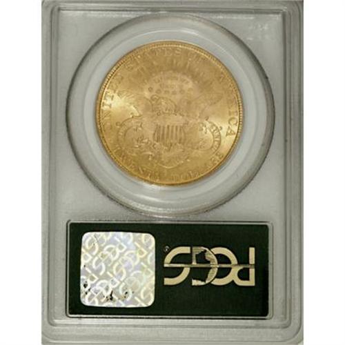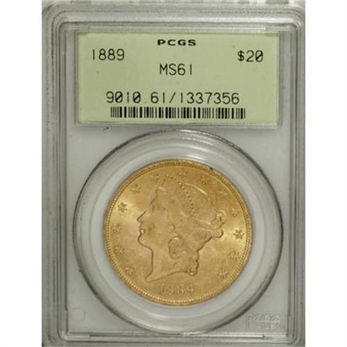 <B>1889 $20 MS61 PCGS.</B></I> A well-defined yellow-orange exemplar with attractive luster and no trace of wear. The slightly haze surfaces show a number of light to moderate abrasions that account for the grade. One of only 44,000 pieces struck.<BR><BR><B>Coin Engraver:</B> James B. Longacre<BR><BR><b>Shipping:</b> Coins & Currency (<a target="_blank" href="http://www.heritageauctions.com/common/shipping.php">view shipping information</a>)
