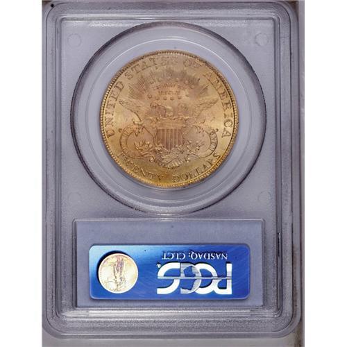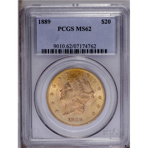 <B>1889<$20> MS62 PCGS.</B></I> Boldly struck and highly lustrous with lovely lime-green and red-orange coloration. A mildly scuffy appearance on the obverse defines the numerical grade level of this attractive Mint State coin. Fewer than 45,000 business strike double eagles were produced in Philadelphia in 1889. As a result, it is a scarce issue in AU55 and finer grades, with none certified any higher than MS63 at either of the major services. Population: 86 in 62, 12 finer (3/06). <BR><BR><B>Important notice:</B> Heritage usually auctions material at the rate of 200-250 lots per hour. On some occasions eBay Live bid software or the Internet may not be able to keep up with the pace of the auction. We recommend placing a realistic absentee bid now as insurance to avoid disappointment. Occasionally the auctioneer may eliminate or reject an eBay Live bid, and the auctioneer may also reopen a lot after the close of the eBay live bidding (usually because we missed an audience bid), and may reject your bid even if it shows you as the winning bidder. By bidding via eBay Live, you agree that Heritage may award the lot to another bidder at its sole discretion under the circumstances described above or any other reasonable circumstances. Since eBay bids are not shown to us until we open the lot on the floor, we treat those bids just like floor bids. In most cases the floor responds before the eBay bid is presented to us, due to Internet lag time, so for consistency we have made it a policy that floor bids are always considered first over tie eBay live bids. Also please note that all Heritage lots purchased through eBay Live carry a 20% Buyer's Premium. Please make sure you read the Terms and Conditions before you bid. This lot is being auctioned in conjunction with a live floor auction by Heritage Galleries & Auctioneers. All final auction and invoice information will be supplied by Heritage Galleries & Auctioneers, and all other information should be considered preliminary. Lot:4317 <BR><BR><B>Winning Notification and Billing:</B> After the FINAL session in this auction is complete, Heritage will send e-mail and snail mail invoices. This process normally takes several days. All final auction and invoice information will be supplied by Heritage Galleries & Auctioneers, and all other information should be considered preliminary. <BR><BR>This auction will be conducted on a live auction floor and over the Internet through eBay Live. If you choose to place an absentee bid, please take a moment to <font color='#0000ff'><u><a href='http://pages.ebay.com/liveauctions/help/before/laabsentee.html'>learn how eBay Live absentee bidding works</a></u></font><font color='#000000'>