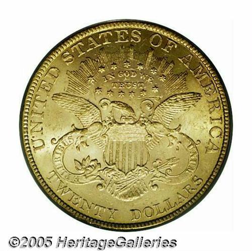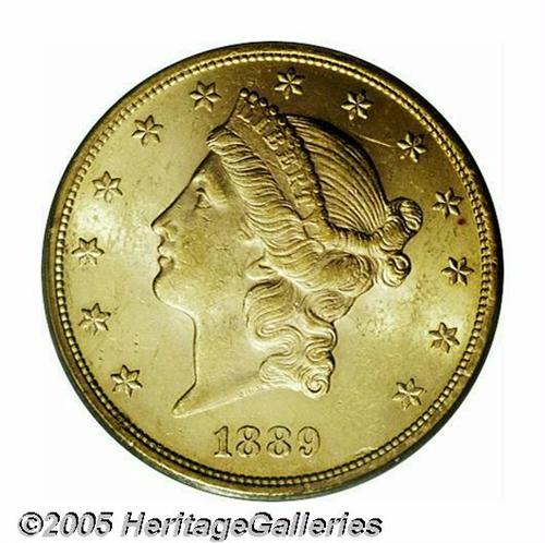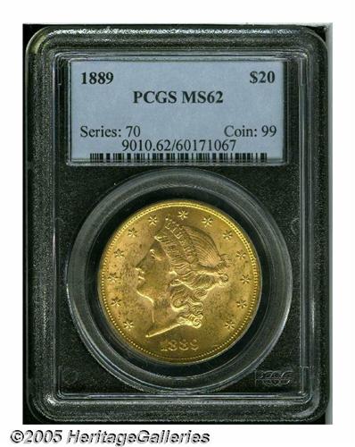 <B>1889<$20> MS62 PCGS.</B></I> Sharply struck and fully brilliant with frosty yellow gold luster and hints of pinkish toning. Not overly rare in this grade, but almost never seen any nicer. Population: 54 in 62, 9 finer (5/05).